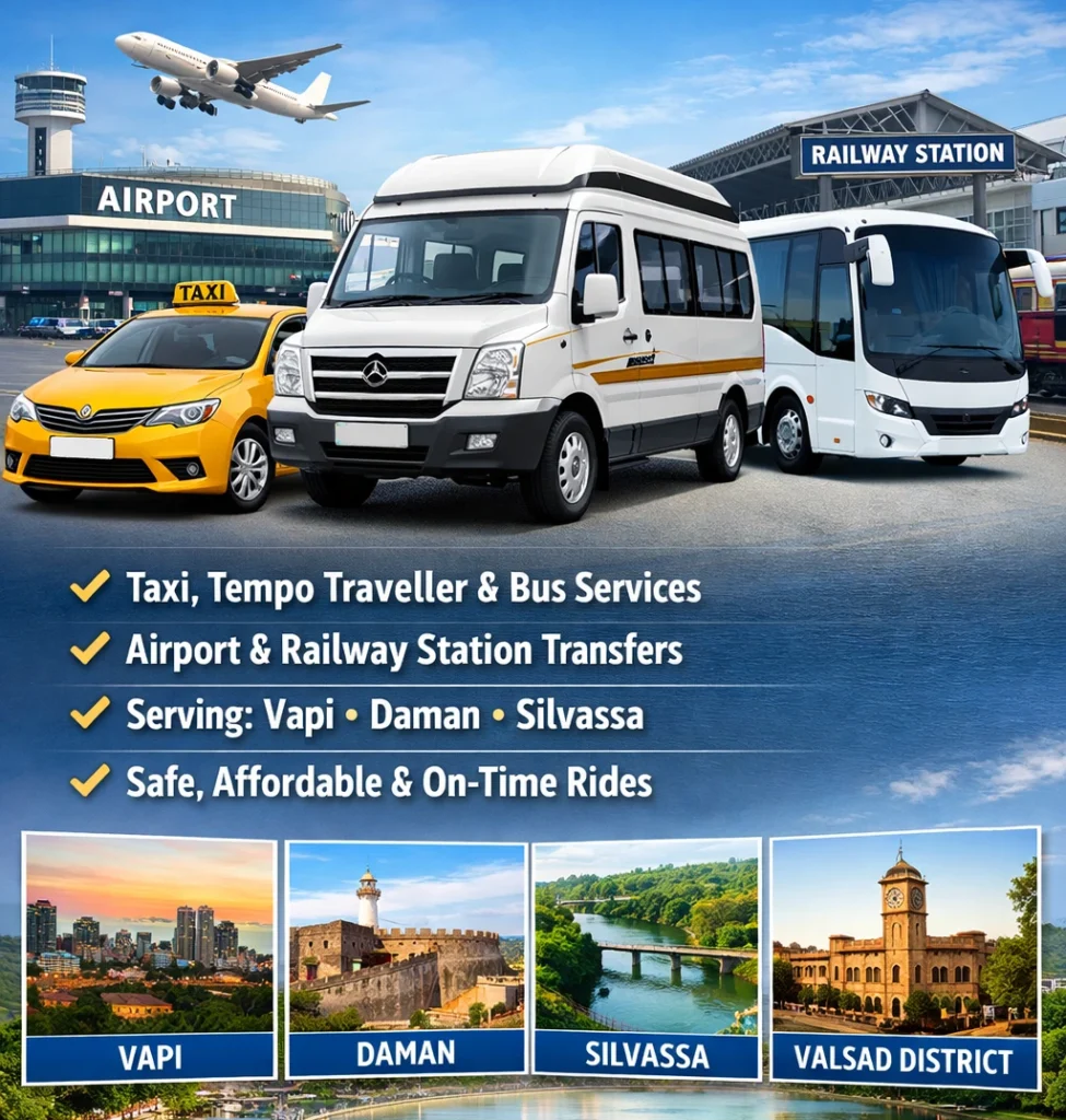 Welcome to Maniar Travels, your premier destination for reliable taxi and cab services. We specialize in providing professional one-way pickups and drops including round-trip journeys across South Gujarat. Whether you need a local city ride or an outstation trip, we are your trusted partner for safe, punctual, and hassle-free transport in Valsad, Vapi, Daman, and Silvassa.